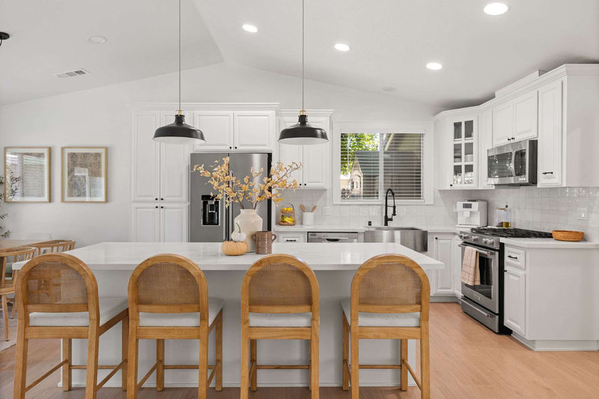 Kingston white 4" x 4" glazed ceramic wall tile for the kitchen backsplash and Texas Sonoma cream stone tile for fireplace. Plus Kingston white 3" x 8" glazed ceramic wall tile for the bathroom.
