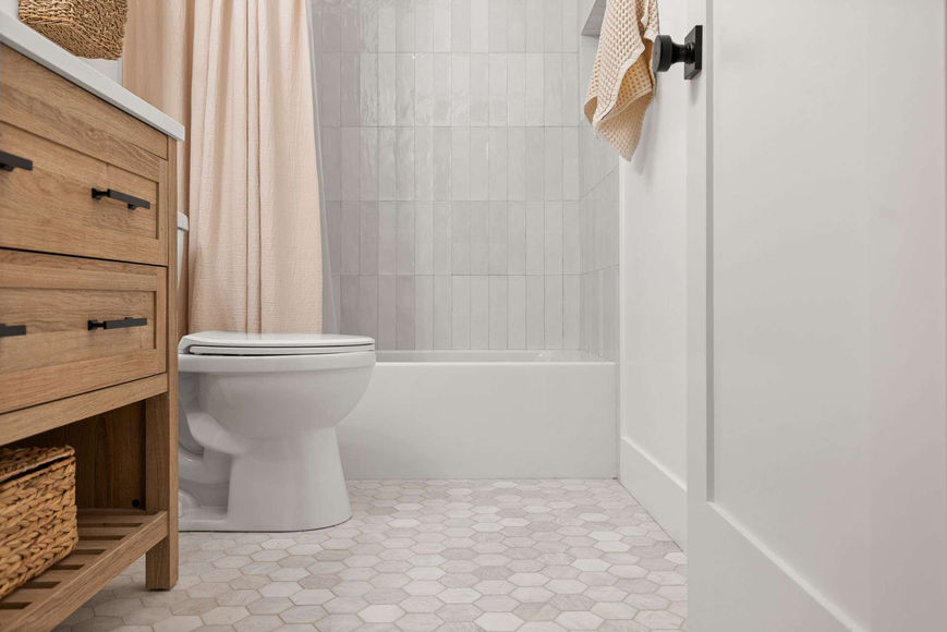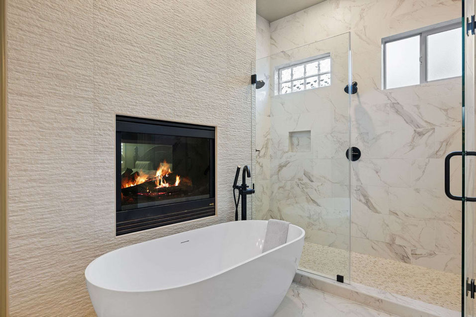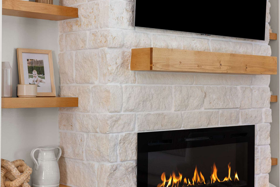 Kingston white 4" x 4" glazed ceramic backsplash wall tile and Texas Sonoma cream stone tile for the fireplace. Kingston white 3" x 8" glazed ceramic wall tile for the bathroom.